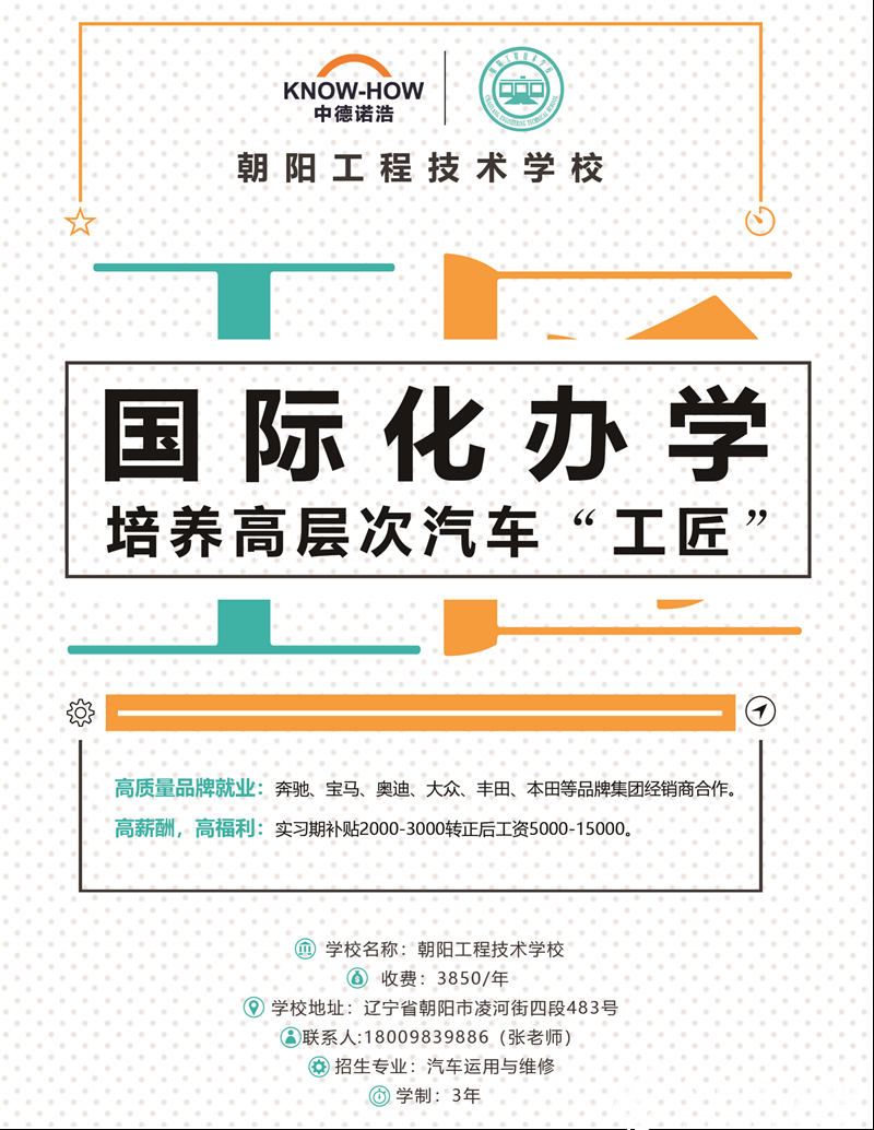 人生最重要的是選擇,選擇正確的奮斗方向,努力就會(huì)收獲累累碩果。歡迎有理想、肯吃苦、愛(ài)汽車(chē)的你來(lái)朝陽(yáng)工程技術(shù)學(xué)校汽車(chē)運(yùn)用與維修專(zhuān)業(yè)中德諾浩汽車(chē)機(jī)電服務(wù)技師班學(xué)習(xí)!