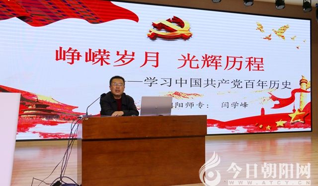 本次黨課邀請了朝陽師范高等??茖W校思想政治理論課教研部主任閆學峰主講。他以《崢嶸歲月,光輝歷程》為題,從“深刻把握黨史學習教育的重大意義;中國共產(chǎn)黨百年歷史;中國共產(chǎn)黨百年歷史給予的啟迪與思考;黨史學習教育要把握‘四個注重’”四個方面為大家呈現(xiàn)了一堂精彩、生動的黨課。閆學峰著重闡述了中國共產(chǎn)黨百年歷史部分,從“開天辟地:中國共產(chǎn)黨在新民主主義革命時期完成救國大業(yè);改天換地:中國共產(chǎn)黨在社會主義革命和建設時期完成興國大業(yè);翻天覆地:中國共產(chǎn)黨在改革開放和社會主義現(xiàn)代化建設新時期推進富國大業(yè);驚天動地:中國共產(chǎn)黨在中國特色社會主義新時代推進并將在本世紀中葉實現(xiàn)強國大業(yè)”四個階段,展示了中國共產(chǎn)黨帶領全國各族人民從崢嶸歲月走向新時代的壯闊畫卷,讓大家重溫了中國共產(chǎn)黨百年輝煌歷程。