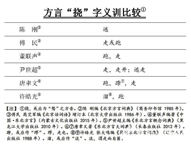 驁之“縱恣奔馳”義,在東北話中應(yīng)可詮釋為“跑遠(yuǎn);跑掉。”在情感色彩層面,偏向貶義。如:前面表中“逃”“逃走”“流(溜)”等釋文。