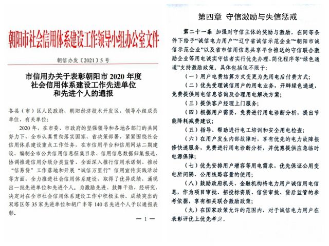 為貫徹落實(shí)朝陽市委市政府關(guān)于“社會(huì)信用體系”、遼寧省公司關(guān)于“誠信遼電”的各項(xiàng)決策部署,朝陽公司作為省公司建立“誠信用電示范區(qū)”、開展“誠信遼電”服務(wù)的試點(diǎn)單位之一,主動(dòng)順應(yīng)社會(huì)經(jīng)濟(jì)發(fā)展趨勢(shì),緊緊圍繞營商環(huán)境建設(shè),積極構(gòu)建完善“電力信用評(píng)價(jià)體系”,實(shí)行守信激勵(lì)和失信懲戒舉措,正確引導(dǎo)客戶誠信用電、安全用電、合法用電,將原來以失信懲戒為主的黑名單變?yōu)橐哉蚣?lì)為主的紅名單,充分鼓勵(lì)誠信客戶發(fā)揮示范引領(lǐng)作用,共同助力地方經(jīng)濟(jì)發(fā)展。