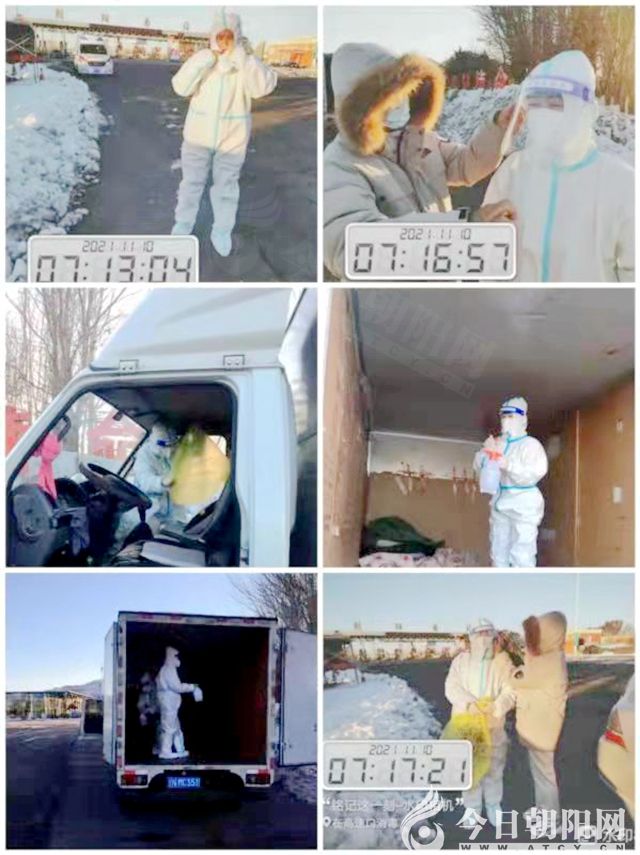11月9日凌晨5時左右,康旭蘭、王玉華、王玉霞三人頂著夜色趕到醫(yī)院,帶上所用物品隨醫(yī)院車輛來到朝陽南高速路口。配送物資的車輛已經(jīng)下了高速,司機(jī)脫掉隔離服被急救高壓艙車接走,進(jìn)行核酸檢測,然后送到指定地點(diǎn)進(jìn)行隔離。車輛及物品的消毒工作就交給了康旭蘭、王玉華、王玉霞三人。她們?nèi)俗龊米陨矸雷o(hù)后對車的駕駛室、后備箱、車身、車輪、車底都進(jìn)行了徹底噴灑消毒。噴灑消毒完畢,半小時之后再次進(jìn)行了擦拭消毒。經(jīng)過一番忙碌,八時多三人收集好產(chǎn)生的垃圾返回醫(yī)院,把垃圾投放到指定的醫(yī)療垃圾點(diǎn),圓滿地完成了此項(xiàng)任務(wù)。