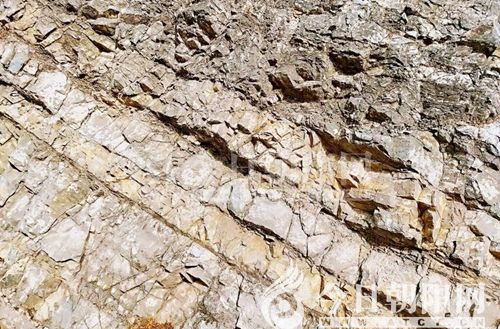 漸至頂峰,遇見一片裸露的山體,巖石層層疊壓,紋理清晰。地質(zhì)構(gòu)造始終是情之所系,遠古洪荒,這里許是湖泊海域,流水沉積,褶皺斷層,風(fēng)力侵蝕,幾經(jīng)蒼海滄田才能出落如此模樣。
