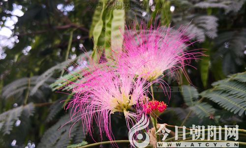 附:合歡,又名絨花樹,馬纓花。落葉喬木,夏季開花,頭狀花序,合瓣花冠,雄蕊多條,淡紅色。