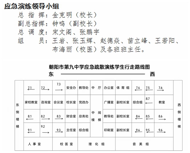 為了組織好本次疏散演練活動(dòng),朝陽(yáng)九中制定了周密的安全疏散演練實(shí)施方案,召開了安排部署會(huì)議,成立了由校長(zhǎng)金克明任總指揮、德育副校長(zhǎng)鐘鳴任副總指揮的應(yīng)急疏散演練領(lǐng)導(dǎo)小組。演練前,學(xué)校進(jìn)行了相關(guān)內(nèi)容培訓(xùn):總調(diào)度、安全辦主任宋文革為演練人員和教師講解了演練的方案流程、自救逃生路線等重要事項(xiàng);各班班主任為學(xué)生們講解了防震減災(zāi)知識(shí)、疏散路線和安全區(qū)域。