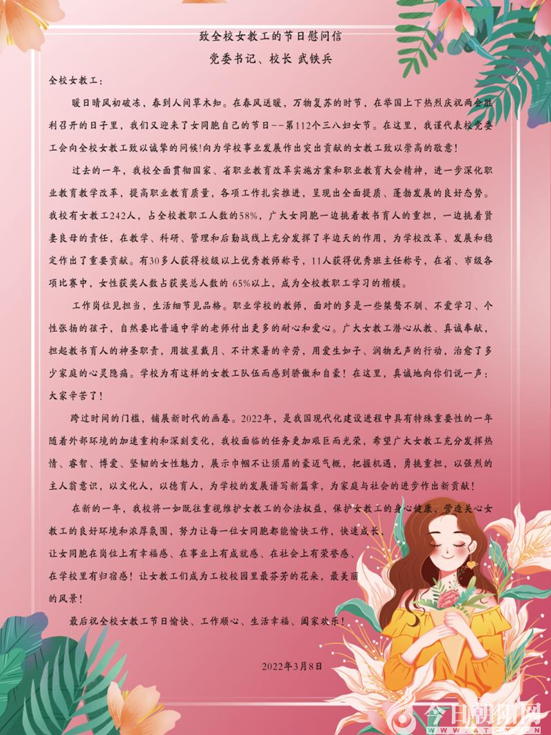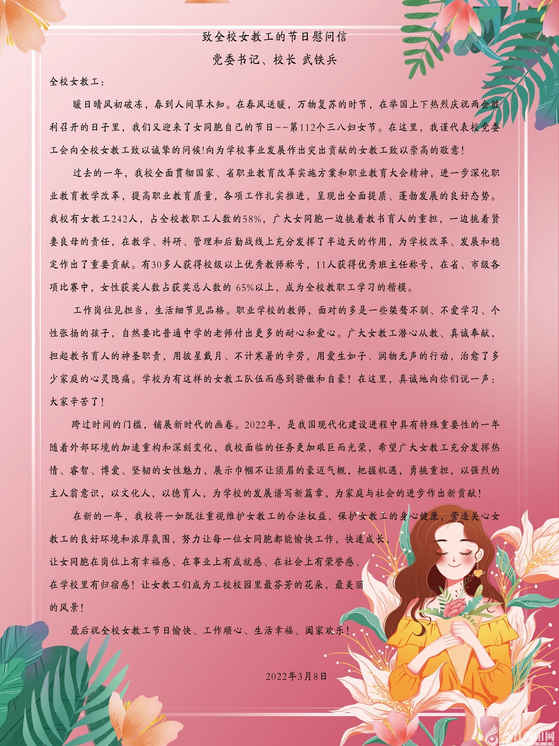 當天早晨,學校黨委書記、校長武鐵兵代表校黨委和工會發(fā)出了《致全校女教工的節(jié)日慰問信》,向全校女教工致以誠摯問候,對她們?yōu)閷W校改革、發(fā)展和穩(wěn)定作出的貢獻表示充分肯定,希望廣大女教工發(fā)揮熱情、睿智、博愛、堅韌的女性魅力,展示巾幗不讓須眉的豪邁氣概,為學校的發(fā)展譜寫新篇章,為家庭與社會的進步作出新貢獻,以優(yōu)異成績向黨的二十大獻禮。