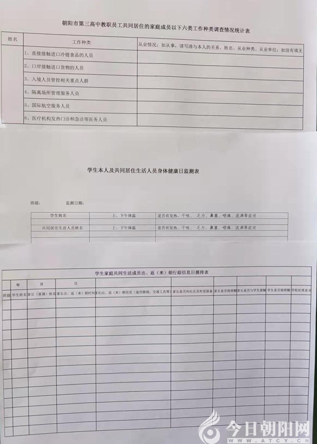 筑牢排查“防火墻”。精準(zhǔn)排查是“外防輸入”的第一關(guān)口。為保障全校師生的生命安全和身體健康,朝陽市三高中對全校師生進(jìn)行了嚴(yán)格排查:全校師生認(rèn)真填寫了《師生本人及共同居住生活人員身體健康日監(jiān)測表》;排查六類人員,即《朝陽市第三高中教職員工學(xué)生共同居住的家庭成員六類工作調(diào)查情況統(tǒng)計》;排查師生共同居住人員出(來)市、出(來)省情況,即《師生家庭共同生活成員出、返(來)朝行蹤信息日摸排表》;在校師生進(jìn)行全員核酸檢測,目前,已經(jīng)進(jìn)行了兩次全員核酸檢測。
