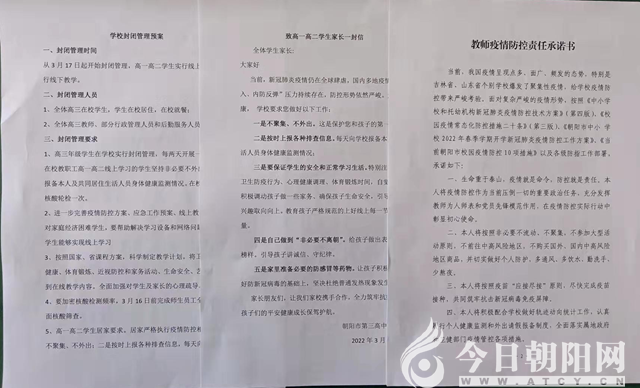 疫情就是命令,嚴(yán)防就是責(zé)任。自3月15日以來,遼寧省朝陽市第三高級中學(xué)依據(jù)《關(guān)于進(jìn)一步加嚴(yán)當(dāng)前疫情防控工作的通告》和《關(guān)于進(jìn)一步加嚴(yán)當(dāng)前疫情防控工作的補(bǔ)充通告》要求,迅速完善相關(guān)應(yīng)急預(yù)案、起草《學(xué)校封閉管理預(yù)案》,并結(jié)合學(xué)校實(shí)際于3月17日開始全體高三學(xué)生實(shí)行全封閉式管理。