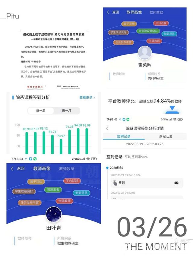 督導(dǎo)是工作前進(jìn)的領(lǐng)航者和推動(dòng)者,朝陽市衛(wèi)生學(xué)校為了保證教育教學(xué)順暢、高效運(yùn)行,專門成立教學(xué)督導(dǎo)辦公室,多年來引領(lǐng)著教育教學(xué)的發(fā)展。線上教學(xué)期間,學(xué)校仍然沒有放松督導(dǎo)工作。制訂了《朝陽市衛(wèi)生學(xué)校線上教學(xué)督導(dǎo)實(shí)施方案》,緊跟云端課堂,把控教學(xué)方向,指導(dǎo)授課模式和方法,并定期發(fā)放線上教學(xué)實(shí)況通報(bào),展示線上教學(xué)成果。