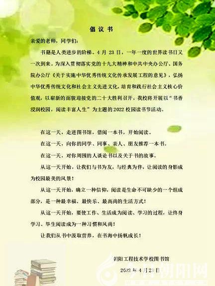 2022年是黨的二十大召開之年,也是學(xué)校開展“雙優(yōu)”建設(shè)向更高層次邁進(jìn)的一年,為深入貫徹習(xí)近平新時(shí)代中國特色社會(huì)主義思想,激發(fā)師生讀書熱情,更好地宣傳社會(huì)主義核心價(jià)值觀,傳承和弘揚(yáng)中華優(yōu)秀傳統(tǒng)文化,在第27個(gè)“世界讀書日”來臨之際,遼寧省朝陽工程技術(shù)學(xué)校圖書館聯(lián)合工會(huì)、團(tuán)委、宣傳中心舉辦以“書香浸潤校園,閱讀豐富人生”為主題的2022年“校園讀書節(jié)”系列活動(dòng)。