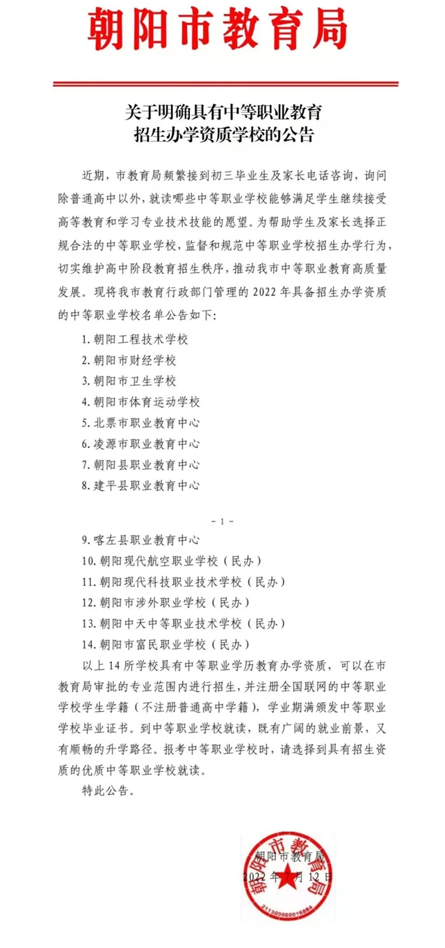 朝陽市教育局關(guān)于明確2022年具備中等職業(yè)教育招生辦學(xué)資質(zhì)學(xué)校的公告