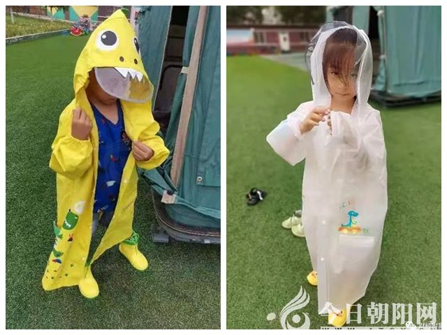 小朋友們在書包里拿出準備好的雨具,自己動手穿戴起來。有的小朋友實在穿戴不上,請求老師幫忙,恐怕慢別人一步。