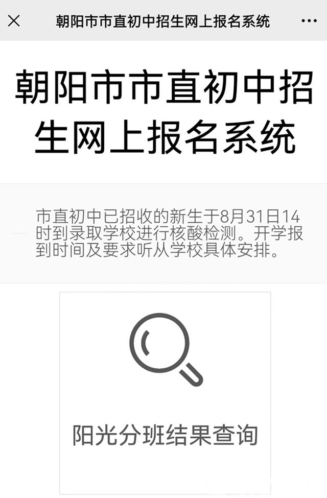 溫馨提示:學生及家長可通過朝陽市市直初中招生網(wǎng)上報名系統(tǒng)查詢分班情況及開學相關事宜(掃描二維碼,按提示填寫資料,查詢相關信息)。