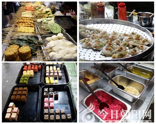 晚上六七點(diǎn)鐘,夜市的各種小吃開始在空氣中散發(fā)著誘人的香味:穿著彩椒的大羊肉串、金光燦燦的小籠包、顏色唯美的缽仔糕、6角一串的串串香……令人食欲滿滿,許多年輕人下班后紛紛叫上朋友來這里放松心情。