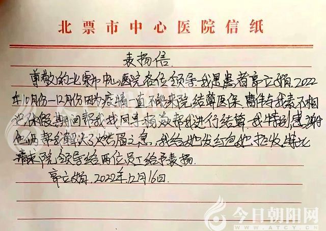 聽聞這個好消息,郭女士深受感動,親筆寫了一封表揚信,信中提到,自己對醫(yī)??乒ぷ魅藛T耐心、貼心、暖心的服務非常滿意,由于工作人員不接受自己的物質感謝,所以想到用寫信的方式表達自己的感激之情。