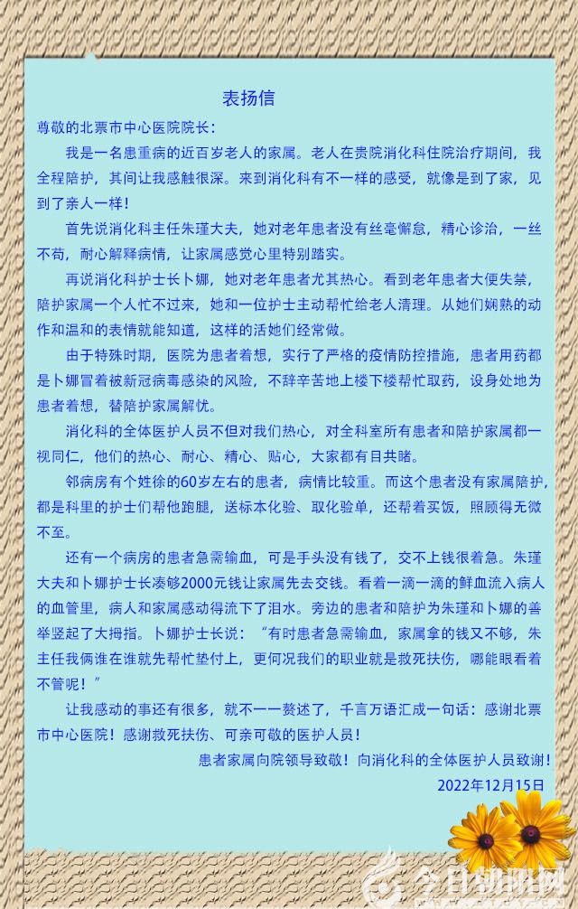近日,一位患者家屬用表揚信的形式向遼寧省北票市中心醫(yī)院消化內(nèi)科的醫(yī)護人員表達了內(nèi)心的感激之情。表揚信語言質(zhì)樸,情真意切,從切身感受到所見所聞,道出了北票市中心醫(yī)院醫(yī)護人員視病人為親人、全心全意為患者服務的高尚情懷。