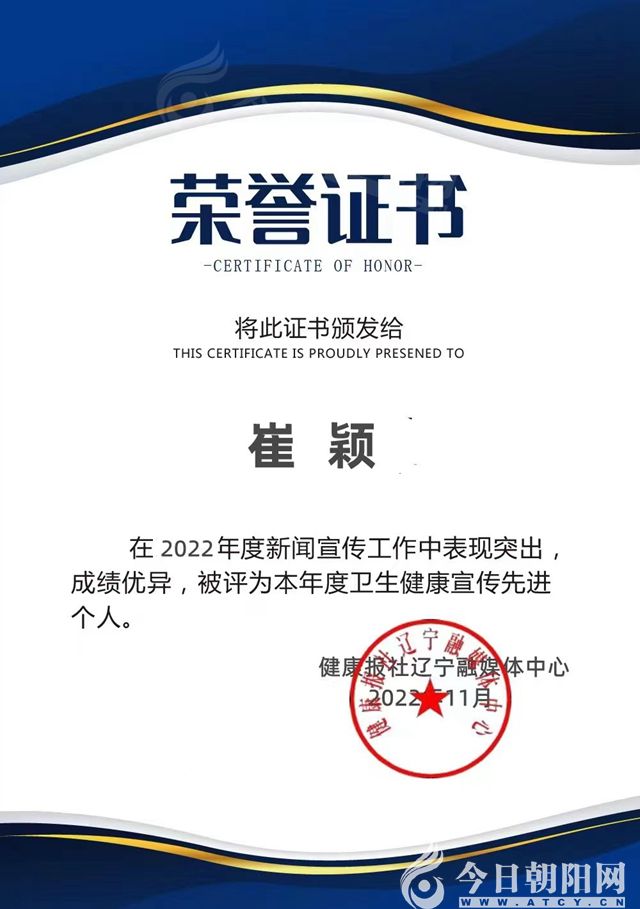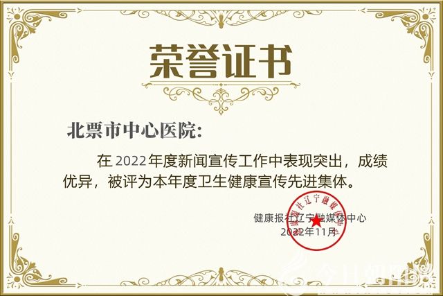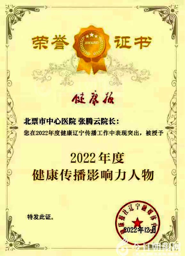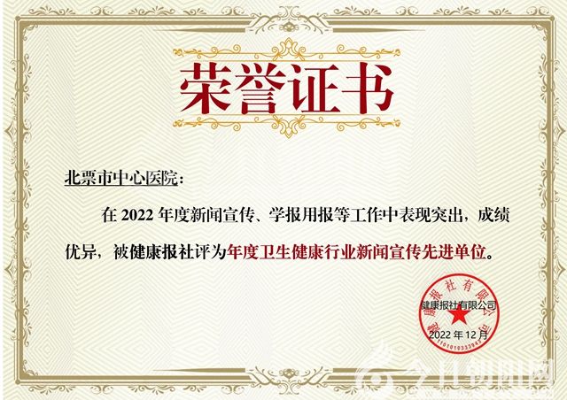 近日,遼寧省北票市中心醫(yī)院被中國健康報社、健康報社遼寧融媒體中心授予“2022年度衛(wèi)生健康行業(yè)新聞宣傳先進(jìn)單位”“2022年度衛(wèi)生健康宣傳先進(jìn)集體”榮譽(yù)稱號;醫(yī)院黨委書記、院長張騰云被授予“2022年度健康傳播影響力人物”榮譽(yù)稱號;宣傳科科長崔穎被授予“先進(jìn)個人”榮譽(yù)稱號。