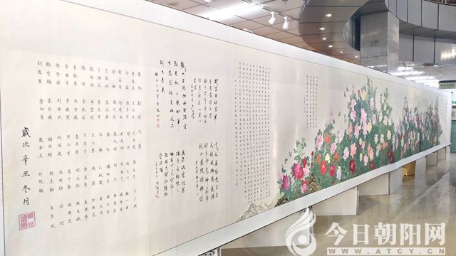據(jù)了解,為了迎接黨的二十大勝利召開,獻(xiàn)禮盛世祖國(guó),深入開展社會(huì)主義精神文明建設(shè),繁榮藝術(shù)創(chuàng)作,龍山書畫院63人參與,歷時(shí)68天,集體創(chuàng)作了《盛世牡丹圖》長(zhǎng)卷?!妒⑹滥档D》總長(zhǎng)16.5米,高2米,包含了繪畫、詩(shī)詞、書法等藝術(shù)形式,體現(xiàn)了龍山書畫院全面過(guò)硬的實(shí)力、高超的藝術(shù)素養(yǎng)以及真摯的愛國(guó)情懷。