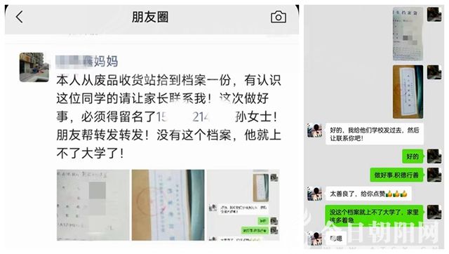 今天,刷朋友圈時看見兒子初中同學的家長發(fā)了消息,要尋找一份檔案的主人。原來愛讀書的她買舊書時,在廢品回收站發(fā)現(xiàn)了一個檔案袋,檔案封面信息顯示主人系二高中學生,細心又善良的她,因為是準大學生家長,深知檔案對一個學生的重要性,當即花錢買下,將其帶回家,然后火速發(fā)朋友圈尋找檔案的主人。消息一發(fā),朋友圈里的好友被這份善良感染,紛紛行動起來,形成了愛心接力。經(jīng)過一番努力,最后終于讓這份重要的檔案物歸原主。檔案的主人拿到檔案非常感動,當即表示到了大學會好好學習,用行動回饋社會。