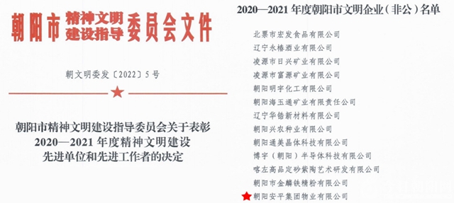 喜訊!朝陽安平集團(tuán)榮獲“2020—2021年度朝陽市文明企業(yè)(非公)”稱號