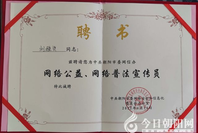 今日朝陽網(wǎng)編輯劉雅賢獲聘“網(wǎng)絡(luò)公益、網(wǎng)絡(luò)普法宣傳員”