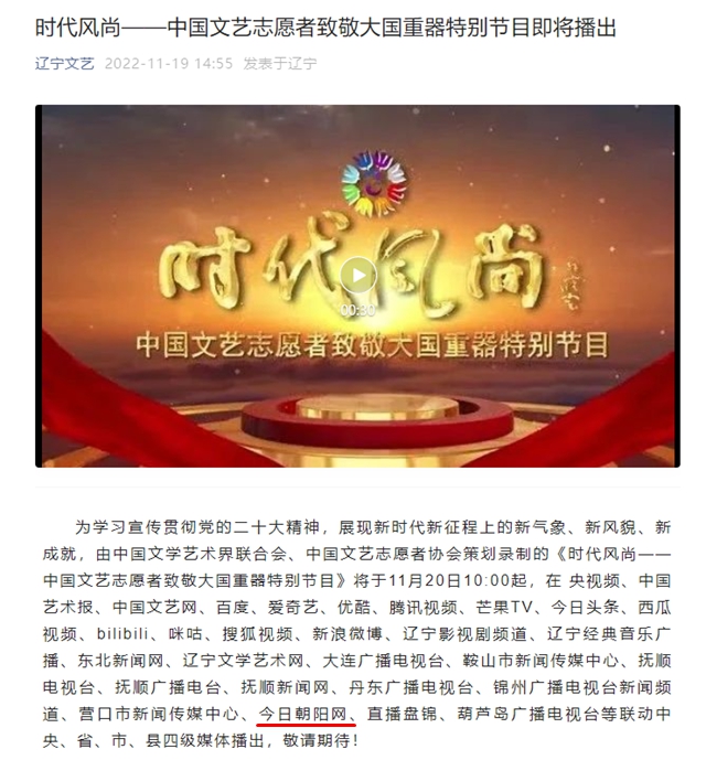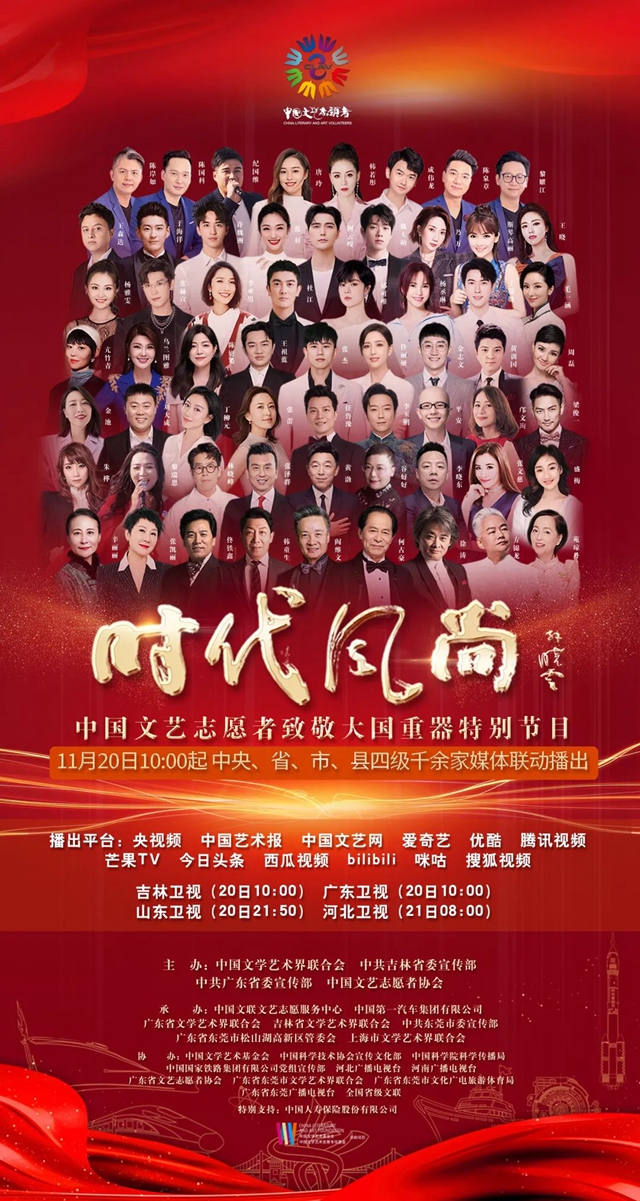 11月20日10:00起,由中國文聯(lián)、吉林省委宣傳部、廣東省委宣傳部、中國文藝志愿者協(xié)會主辦的“時代風(fēng)尚”——中國文藝志愿者致敬大國重器特別節(jié)目正式在央視頻、中國藝術(shù)報、中國文藝網(wǎng)、愛奇藝、優(yōu)酷、騰訊視頻、芒果TV、今日頭條、西瓜視頻、bilibili、咪咕、搜狐視頻等中央、省、市、縣四級千余家媒體同步上線播出。吉林衛(wèi)視(20日10:00)、廣東衛(wèi)視(20日10:00)、山東衛(wèi)視(20日21:50)、河北衛(wèi)視(21日8:00)等電視臺也將陸續(xù)播出。
