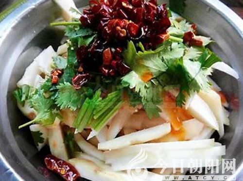 我用水把它沖洗干凈后,切成條狀,在里面放了少許生抽和陳醋,再放一點(diǎn)香油和香菜碎,黃黃綠綠,咸淡適中,可以說色香味俱全。因?yàn)樯ぷ觿偤茫瑳]敢放辣椒油,若是淋上一層辣椒油,那就更美味了。