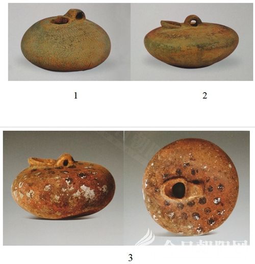 圖四 內(nèi)蒙古敖漢旗博物館藏品及敖漢旗新州博物館藏品[1、“之”字紋彩陶短流提梁壺(敖漢旗博物館藏) 2、彩陶短流提梁壺(敖漢旗博物館藏) 3、短流提梁彩陶壺(敖漢旗新州博物館藏)]這件壺出于敖吉鄉(xiāng)的哈喇海吐紅山文化遺址(圖片選自《新州博物館簡(jiǎn)介》第1頁(yè),屬內(nèi)部印刷品)。這4件標(biāo)本分別在敖漢東南牤牛河流域和敖漢中部的教來河流域有出土,且均發(fā)現(xiàn)于紅山文化遺址之上,說明這種壺的使用范圍較廣,且與日常生活相關(guān)。流正面為瓦溝形,向端漸收出尖,這樣的設(shè)計(jì)在從壺里往外傾倒時(shí)便不會(huì)四溢而集中成流線狀注入飲具里。敖漢旗新州博物館藏:短流提梁彩陶壺,紅山文化時(shí)期,泥質(zhì)紅陶,共同特點(diǎn)是扁圓體,頂偏一側(cè)有外侈的小流,連橋狀小提梁,繞頂點(diǎn)黑色圓點(diǎn)共五排,平底。此類壺帶流也是盛珍貴飲品的器皿,進(jìn)一步說明在五千年前既有控制流量的類似酒的飲料存在。此類器物只有一個(gè)進(jìn)出口,應(yīng)與漏斗配套使用。頂出一橋形提梁是為提攜方便和掌握傾注的角度。這類壺當(dāng)為分酒具。