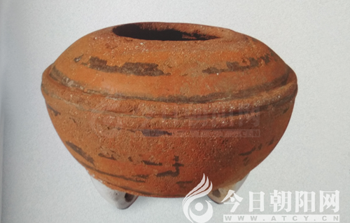 圖五:敖漢旗那珍溝遺址出土的三足彩陶斂口罐過去很少見到紅山文化的陶質(zhì)三足器。這件三足器為夾砂紅陶,底沿加三足當(dāng)為加溫所設(shè),又是斂口無頸,很顯然是加工液體所設(shè)。所夾的砂粒很細(xì),似經(jīng)過篩選后再加入。紅山文化的彩陶器多為泥質(zhì)陶。此三足陶器夾有細(xì)砂,完全從加溫的角度考慮。