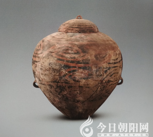 圖六:牛河梁遺址出土的帶蓋彩陶甕(罍)敖漢旗第二次文物普查中,在薩力巴鄉(xiāng)的一處紅山文化遺址中采集一件高達(dá)64厘米小口彩陶,肩上加雙耳,亦當(dāng)為儲(chǔ)酒器[11](圖七)。