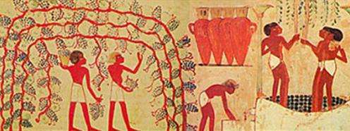 圖九:古埃及采摘葡萄釀制步驟和飲用葡萄酒的壁畫?。ǘ┲袊?guó)古籍的記載與考古發(fā)掘出土的實(shí)證