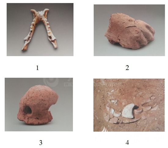 圖十二:牛河梁女神廟遺址出土的泥塑熊殘件和灰坑出土的黑熊下頜骨(1.黑熊下頜骨;2.泥塑熊爪;3.泥塑熊吻部;4.泥塑熊下頜骨殘件)說明了在其祖廟這樣神圣的廟里,竟有熊神的尊位,熊成了紅山人不可替代的“圖騰”。熊頭骨的存在,代表紅山人崇拜的熊神偶像;代表氏族的圖騰,體現(xiàn)著以熊為部落祖先的血緣觀念;代表的是熊神使者,即人與熊神溝通的中介物 [26]。其次才是鳥的泥塑像。有學(xué)者甚至由此認(rèn)為紅山先民即為“有熊氏”,也就是黃帝族的“圖騰”,具有一定的道理。