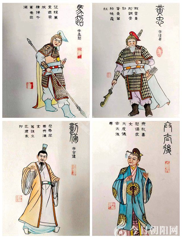 劉玉旻退休后,便專心作畫,筆墨傳神。先期完成了計劃中的380位三國人物素描。后來在曹永玲、董江濤夫婦的建議下,歷時11個月完成了438幅彩墨人物工筆畫像。他說:“最難的是每幅畫中的對聯(lián),先選定幾位人物,閱讀相關(guān)資料,再把描述人物的大量文字,濃縮到14副必須對仗的對聯(lián)里。當一副對聯(lián)完成后,開始繪畫,并用篆字將人物名字和對聯(lián)填寫到畫中。”仔細端詳每幅人物工筆畫,各有千秋,獨具特色,用篆字書寫楹聯(lián)名字,更非一日之功。