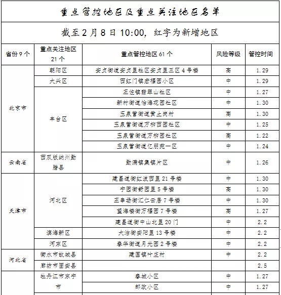 二、重點管控地區(qū)來(返)朝人員實施14天集中隔離醫(yī)學觀察。截至2月8日10時重點管控地區(qū)詳見附件。