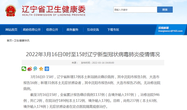 原文鏈接:2022年3月16日0時至15時遼寧新型冠狀病毒肺炎疫情情況