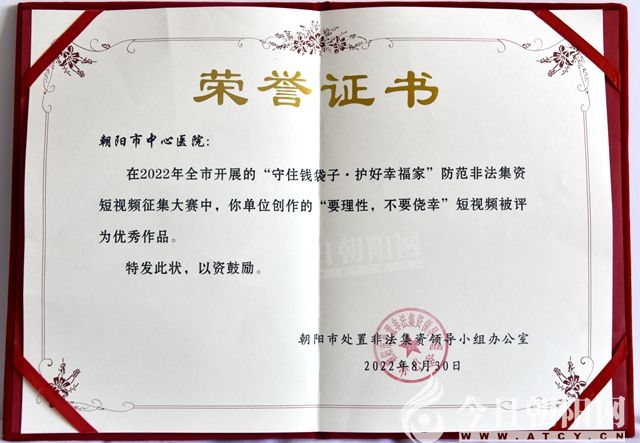 喜訊再至!朝陽市中心醫(yī)院榮獲全市防范非法集資短視頻征集大賽優(yōu)秀作品獎