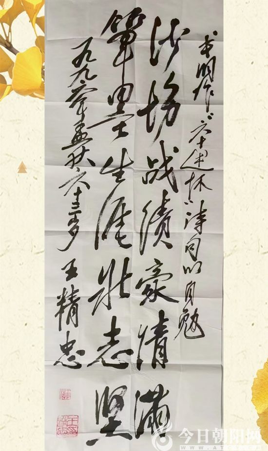 王精忠不但是著名作家,還是一位書(shū)法家。1996年他接到我的求字信后,給我寄來(lái)一張“朝鮮上甘嶺戰(zhàn)役留影”的照片。同時(shí)寫(xiě)了一幅作品寄來(lái),內(nèi)容是“沙場(chǎng)戰(zhàn)績(jī)豪情滿 筆墨生涯壯志堅(jiān)”。題上款“書(shū)舊作《六十述懷》詩(shī)句以自勉”。下款“一九九六年孟秋六十三歲,王精忠”。這么多年,每當(dāng)看到他的照片和作品,我就想起了黃繼光,想起了邱少云,想起了上甘嶺的英雄兒女們,想起了那些最可愛(ài)的人。