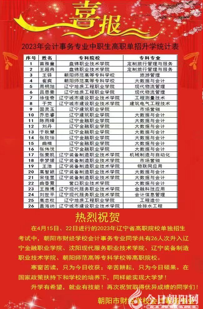 在2023年遼寧省高職院校單獨(dú)招生考試中,會(huì)計(jì)事務(wù)專業(yè)共有26名學(xué)生考入遼寧金融職業(yè)學(xué)院、沈陽(yáng)現(xiàn)代服務(wù)職業(yè)技術(shù)學(xué)院、遼寧裝備制造職業(yè)技術(shù)學(xué)院、朝陽(yáng)師范高等??茖W(xué)校等高職院校。
