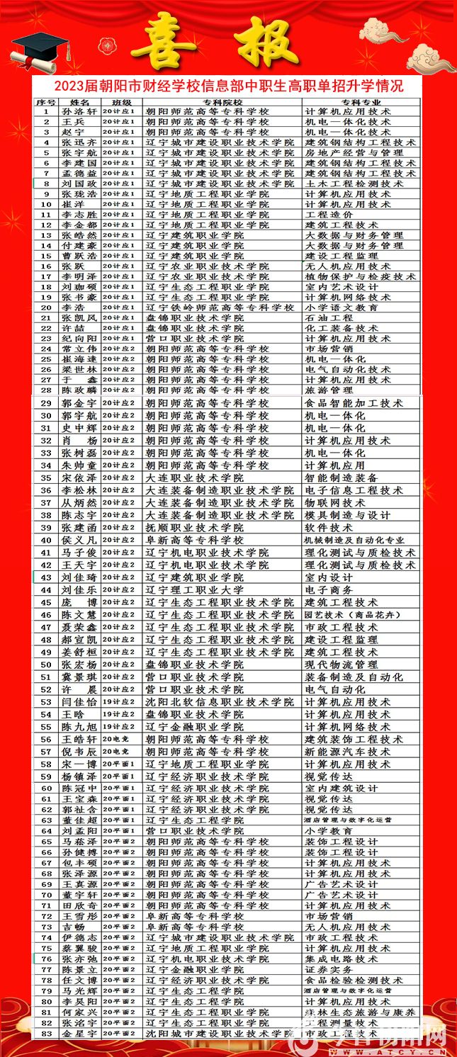 學校為學生打開就業(yè)、升學雙渠道,學生在校既可選擇就業(yè)又可選擇中職升學。計算機應(yīng)用技術(shù)專業(yè)與遼寧地質(zhì)工程職業(yè)學院、錦州師范高等專科學校計算機應(yīng)用專業(yè)開展聯(lián)合辦學;平面設(shè)計專業(yè)與朝陽師范高等專科學校視覺傳達設(shè)計專業(yè)開展聯(lián)合辦學;物聯(lián)網(wǎng)技術(shù)應(yīng)用專業(yè)與錦州師范高等??茖W校物聯(lián)網(wǎng)應(yīng)用技術(shù)專業(yè)聯(lián)合辦學;計算機網(wǎng)絡(luò)技術(shù)專業(yè)與遼寧建筑職業(yè)學院計算機網(wǎng)絡(luò)技術(shù)專業(yè)聯(lián)合辦學;動漫與游戲制作與遼寧生態(tài)工程職業(yè)學院動漫制作技術(shù)專業(yè)聯(lián)合辦學。實行“3+2”的聯(lián)合辦學模式,為學生的學歷晉升打造了更好通道。(注:“3+2”聯(lián)合辦學報名條件為應(yīng)屆初中畢業(yè)生參加中考后在初中報名。)2023年本專業(yè)單招考試總錄取人數(shù)83人。