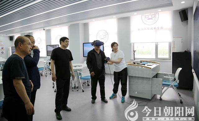 在工校黨委書(shū)記、校長(zhǎng)武鐵兵和副校長(zhǎng)馮繼軒的陪同下,張立昌、王樹(shù)文參觀了學(xué)校的智慧教室,并親自體驗(yàn)了VR實(shí)訓(xùn)設(shè)備。