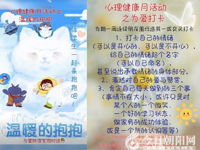 心理教研部還開展了溫暖的抱抱、為愛打卡等活動,鼓勵同學(xué)們勇敢表達愛,釋放心里的溫暖,感染自己、感染他人。