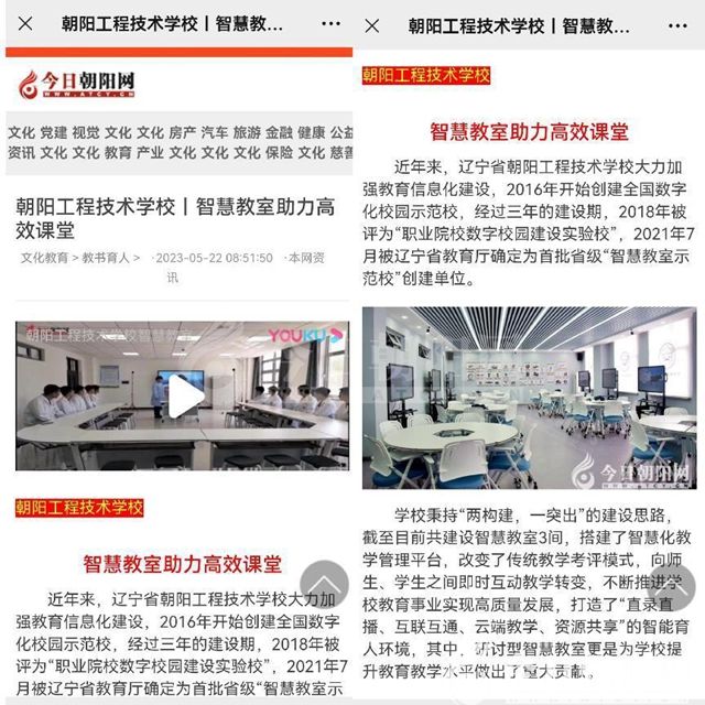 在職業(yè)教育活動周期間,學校扎實推進教育信息化融合創(chuàng)新發(fā)展,運用新媒體平臺總結(jié)宣傳學校近年來職業(yè)教育數(shù)字化建設(shè)、智慧校園建設(shè)成果等。在《今日朝陽網(wǎng)》上發(fā)布“智慧教室助力高效課堂”視頻+智慧教室介紹,充分展示了“直錄直播、互聯(lián)互通、云端教學、資源共享”的智能育人環(huán)境。還借助宣傳單頁與信息化手段,展示學校在人才培養(yǎng)、職普融通、產(chǎn)教融合、科教融匯等方面的亮點、特色和優(yōu)勢。