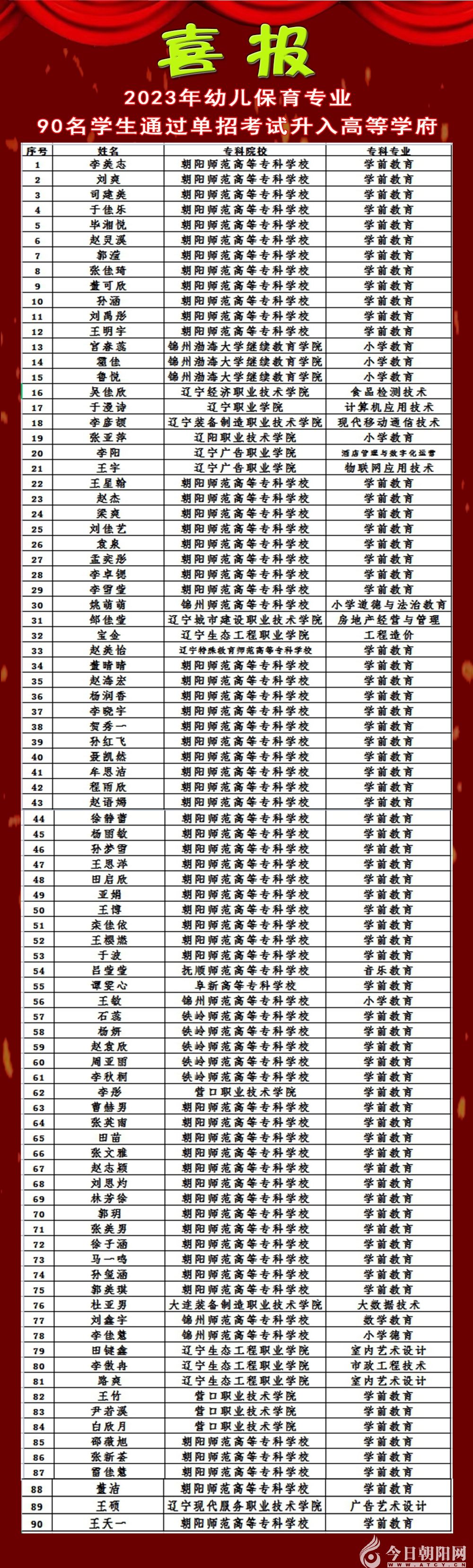 遼寧省朝陽市財經(jīng)學(xué)校幼兒保育專業(yè)(原學(xué)前教育專業(yè)),是省級示范專業(yè),也是學(xué)校主打的特色專業(yè)。2021年被評為遼寧省中等職業(yè)學(xué)校優(yōu)質(zhì)專業(yè)A類。其前身是朝陽市職業(yè)高中藝術(shù)幼師專業(yè),朝陽市第一支幼教隊伍從這里誕生。該專業(yè)成立40年來,培養(yǎng)優(yōu)秀幼教人才4000余人,為朝陽市學(xué)前教育領(lǐng)域輸送了大量復(fù)合型專業(yè)人才。據(jù)不完全統(tǒng)計,該校幼兒保育專業(yè)畢業(yè)生幾乎遍布全市各幼兒園,撐起了朝陽市幼兒教育的半邊天。