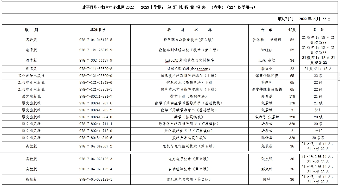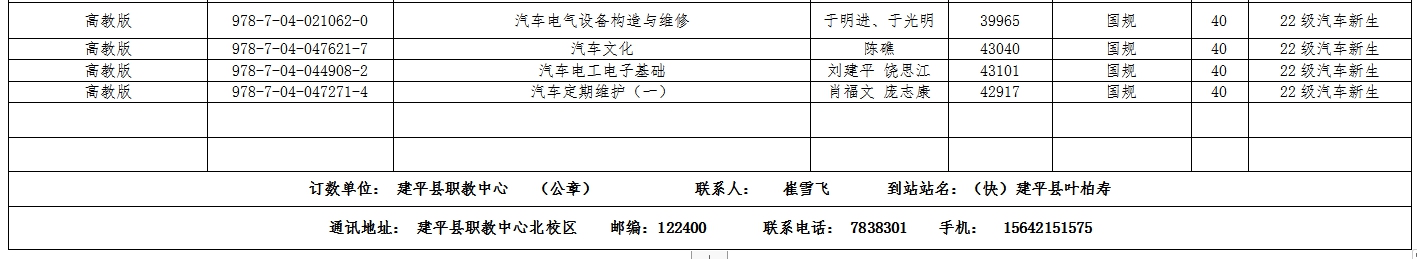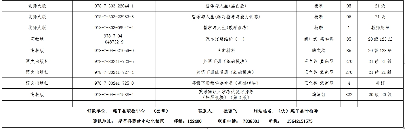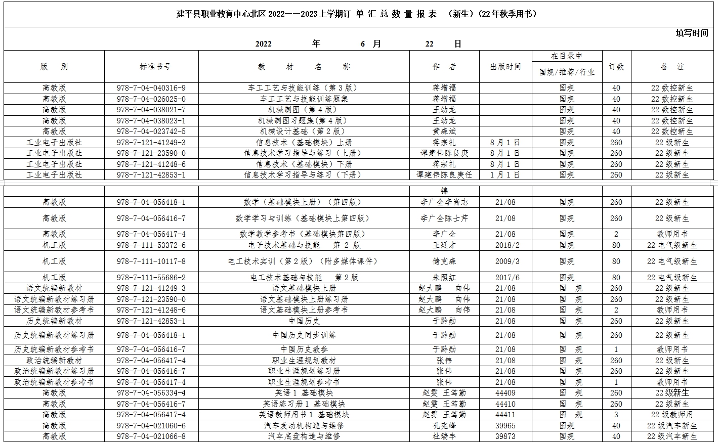 根據(jù)《職業(yè)院校教材管理辦法》以及國家和地方關(guān)于教材管理的政策規(guī)定,建平縣職業(yè)教育中心對2022年秋季教材選用進行了審核,經(jīng)任課教師或課程負責(zé)人推薦、教研 組長把關(guān),教務(wù)處、教材審核委員會及黨組織審核,確定了2022年秋季教材選用結(jié)果,現(xiàn)予以公示,公示期一周。如對選用教材有異議,可以書面形式寄送給教務(wù)處。單位提出的異議,須在異議材料上加蓋本單位公章,并寫明聯(lián)系人姓名和電話;個人提出的異議,須在異議材料上簽署真實姓名,并寫明本人工作單位 和電話。不符合上述要求的異議,不予受理。
