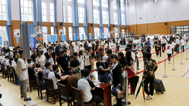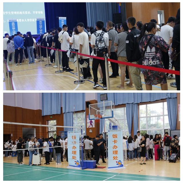 新生報到處設(shè)在寬敞的體藝館內(nèi)。精心布置過的體藝館,清晰劃分出數(shù)個功能區(qū),按著指引標(biāo)識,新生們按照報到流程依次完成面試、填表注冊、編入班級、繳費領(lǐng)卡、領(lǐng)取物品等流程。住宿生在志愿者的引領(lǐng)和幫助下有序入住宿舍。