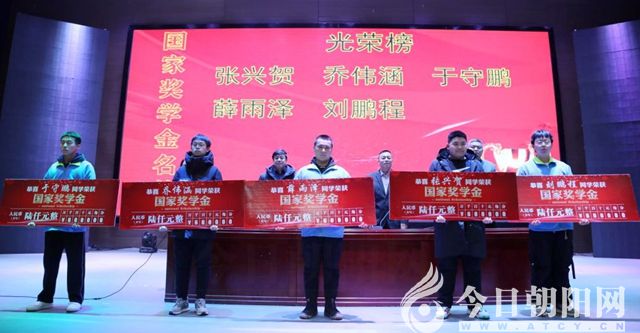 馮繼軒宣讀了《朝陽工程技術(shù)學(xué)校2022-2023學(xué)年國家獎學(xué)金獲得者名單》,于守鵬、張興賀、喬偉涵、薛雨澤、劉鵬程5名學(xué)生獲得國家獎學(xué)金。