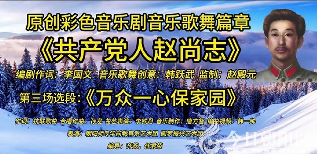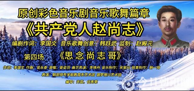 彩色音樂劇《共產(chǎn)黨人趙尚志》由朝陽市委宣傳部牽頭指導(dǎo),朝陽市文學(xué)藝術(shù)界聯(lián)合會、朝陽市音樂家協(xié)會組織創(chuàng)作。本次展演對音樂劇中音樂歌舞篇章中的序幕《呼喚英雄》、第三場選段《萬眾一心保家園》、第四場選段《思念尚志哥》進行了展演。精美的舞臺設(shè)計、生動感人的劇情、惟妙惟肖的角色扮演,引來掌聲連連。彩色音樂劇巜共產(chǎn)黨人趙尚志》是賡續(xù)黨的紅色血脈,弘揚黨的優(yōu)良傳統(tǒng)的一部精品力作,為朝陽打造紅色文化品牌增添了濃墨重彩的一筆,讓我們共同期待該劇的完整呈現(xiàn)!