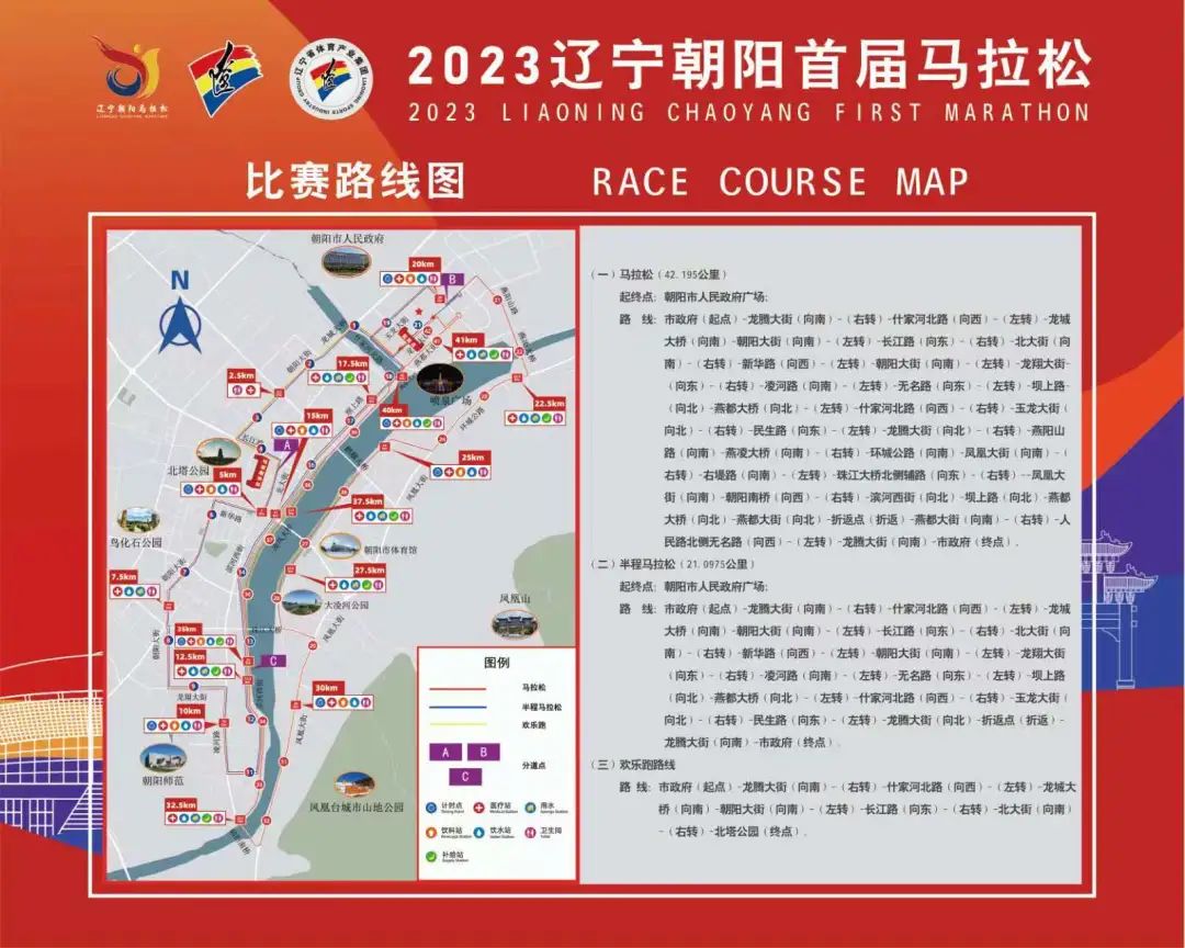 賽事起點(diǎn)設(shè)在市政府廣場(chǎng),全程馬拉松賽道以朝陽大街和大凌河為主線,途經(jīng)萬達(dá)廣場(chǎng)、商業(yè)城、興隆大家庭商業(yè)區(qū);北塔公園、佑順?biāo)?、南塔歷史文化區(qū),人民公園、大凌河、鳳凰山景區(qū),以朝陽南橋?yàn)檎鄯迭c(diǎn),歡樂跑的終點(diǎn)設(shè)于北塔廣場(chǎng),馬拉松和半程馬拉松終點(diǎn)回到市政府廣場(chǎng);讓選手在享受馬拉松運(yùn)動(dòng)健康快樂的奔跑途中盡情欣享朝陽城市建設(shè)新成果,欣賞凌河兩岸秀美風(fēng)光,體驗(yàn)歷史文化,感受朝陽熱情好客氛圍。