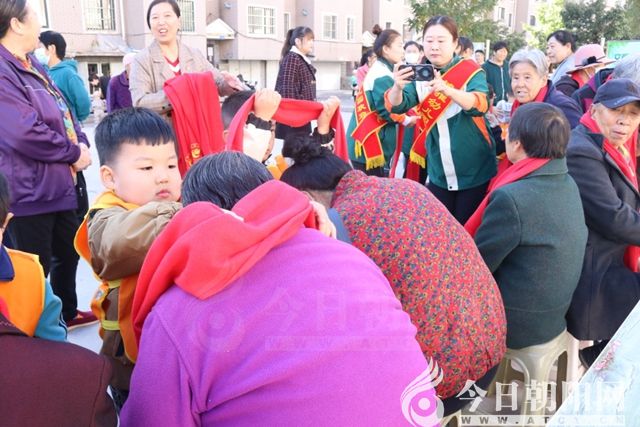 當(dāng)天上午,中華園社區(qū)黨建文化廣場鑼鼓喧天熱鬧非凡,居民們把活動現(xiàn)場圍得水泄不通。博雅幼兒園的小朋友們?yōu)閰⒓踊顒拥?0多位老人佩戴了大紅圍巾。之后,在老師的指導(dǎo)下,孩子們?yōu)槔先藗儽硌萘耸謩菸琛吨腥A孝道》、舞蹈《九月九》等精彩節(jié)目,老人們一張張飽經(jīng)歲月滄桑的臉上,綻放出孩子般的天真幸福,高興地和孩子們一起跳起了健身操。已是古稀之年的博雅幼兒園園長陳玉娥給孩子們講了自己的童年故事,教育孩子珍惜今天的幸福生活,長大后成為報(bào)效祖國、造福社會的棟梁之才。