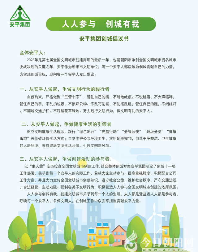 創(chuàng)建全國文明城市是一項惠民工程,朝陽安平集團全體員工以實際行動助力創(chuàng)城工作,既履行了社會責任,展示了企業(yè)的良好形象,又為朝陽市的創(chuàng)城工作貢獻了一份力量。