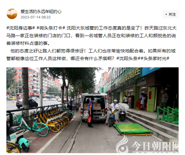 摘要:近日,遼寧朝陽安平集團派駐沈陽市大東區(qū)城市管理綜合執(zhí)法局工作人員李鑒霖在文明巡防值勤時,被一位網(wǎng)名為“愛生活的永遠的心”的網(wǎng)友拍照記錄,并發(fā)布在今日頭條上,得到了大量點贊、轉(zhuǎn)發(fā)和正向評論,引起社會廣泛關(guān)注。